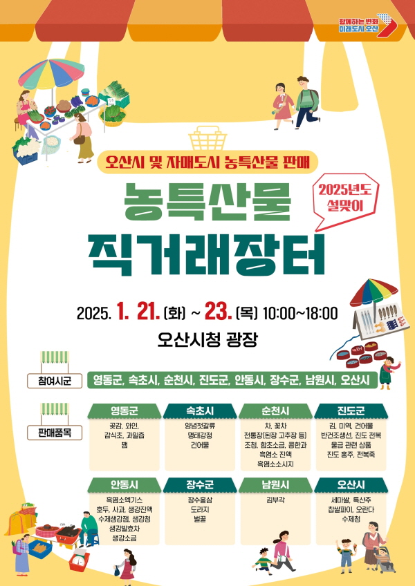 ¿À»ê½Ã, ¼³¸ÂÀÌ ³óƯ»ê¹° Á÷°Å·¡ÀåÅÍ °³Àå - 1¿ù 21(È)~23ÀÏ(¸ñ) 3Àϰ£ ½Ãû ±¤Àå¼ Àڸš¤Ä£¼±µµ½Ã ³óƯ»ê¹° Á÷°Å·¡ |