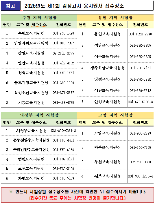 µû¶ó¼ ÇöÀå Á¢¼ö ½Ã ¹Ýµå½Ã Á¢¼öÀå¼Ò(±³À°Áö¿øÃ»)º° ½ÃÇèÁö±¸¸¦ »çÀü¿¡ È®ÀÎÇØ¾ß ÇÑ´Ù.
