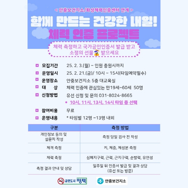ÆòÅýÃ(½ÃÀå Á¤Àå¼±) ¾ÈÁߺ¸°ÇÁö¼Ò¿¡¼´Â ¿À´Â 20ÀϱîÁö ¾ÈÁߺ¸°ÇÁö¼Ò¿Í ¡®ÇÔ²²ÇÏ´Â ³»ÀÏ! ü·Â ÀÎÁõ ÇÁ·ÎÁ§Æ®¡¯ Âü¿©ÀÚ 50¸íÀ» ¼±Âø¼ø ¸ðÁýÇÑ´Ù.