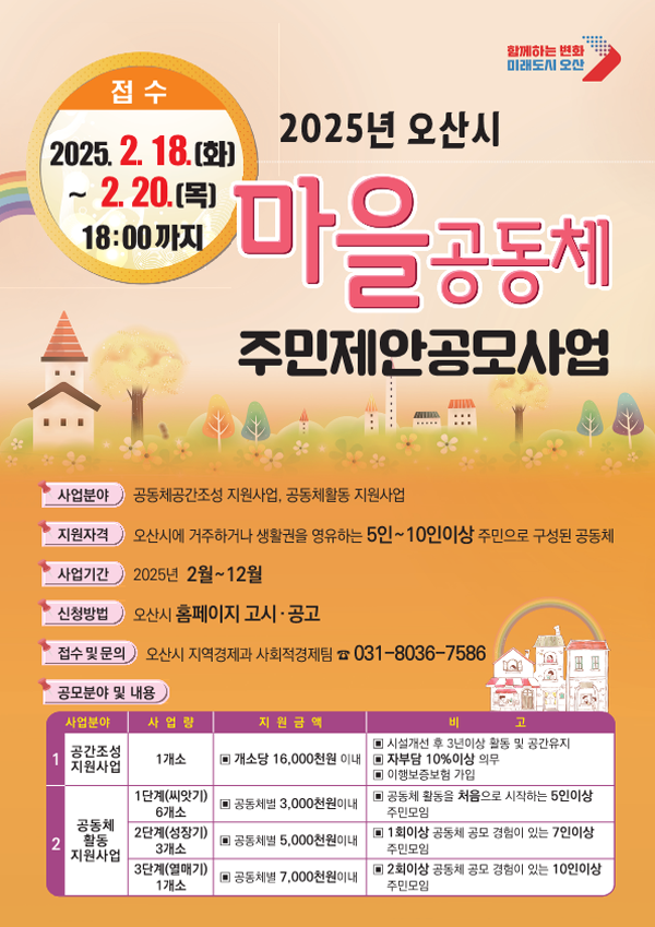 ¸¶À»°øµ¿Ã¼ ÁÖ¹ÎÁ¦¾È °ø¸ð»ç¾÷Àº ¿À»ê½Ã ÁÖ¹ÎÀÌ ÀÚ¹ßÀûÀ¸·Î µû¶æÇϰí ÇູÇÑ »îÀ» ¸¸µé¾î °¡´Â ¸¶À»°øµ¿Ã¼¸¦ ÅëÇØ ÀÌ¿ô °£ ¼ÒÅë ¹× °øµ¿Ã¼ Ȱ¼ºÈ¿¡ ±â¿©ÇÏ´Â »ç¾÷À¸·Î °ø°£Á¶¼º ºÐ¾ß¿Í °øµ¿Ã¼ Ȱµ¿ÀÇ µÎ ºÐ¾ß¿¡ ÃÑ 5õ 6¹é¸¸ ¿øÀÇ »ç¾÷ºñ¸¦ Áö¿øÇÑ´Ù.