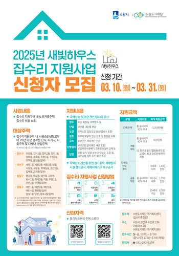 »õºûÇϿ콺 »ç¾÷ ½ÅûÀ» ¿øÇÏ´Â ÁÖÅà ¼ÒÀ¯ÀÚ´Â ¼ö¿ø½Ã Áý¼ö¸®ÅëÇÕÇ÷§Æû(www.suzip.or.kr)¿¡¼ ½Åû ÀÚ°ÝÀ» È®ÀÎÇÑ ÈÄ ¼ö¿ø½Ã¿¡ µî·ÏµÈ Áý¼ö¸® Áö¿ø¾÷ü(92°³¼Ò)¿Í ÇÔ²² ½Åû ¼·ù¸¦ ¼ö¿øµµ½ÃÀç´ÜÁְź¹Áö¼¾ÅÍ(±Ç¼±±¸ ¼öÀηΠ´õÇÔÆÄÅ© 2Ãþ)¿¡ ¹æ¹®ÇØ Á¦ÃâÇØ¾ß ÇÑ´Ù.