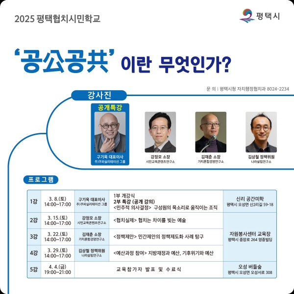 ¡®ÆòÅÃÇùÄ¡ ½Ã¹ÎÇб³¡¯´Â ½ÃÁ¤¿¡ Âü¿©ÇϰíÀÚ ÇÏ´Â ½Ã¹ÎµéÀÌ °ø°øºÎ¹®¿¡ ´ëÇÑ ÀÌÇØÀÇ Æø°ú ¿ª·®À» ³ô¿© ±¸Ã¼ÀûÀÎ Á¤Ã¥ Á¦¾È ¹× °øµ¿ ½ÇÇà¿¡ Âü¿©ÇÒ ¼ö ÀÖµµ·Ï ¸ÅÇØ ¿î¿µÇϰí ÀÖÀ¸¸ç, 2025³â ¿ÃÇØ¿¡´Â ¡®°øÍë°øÍì À̶õ ¹«¾ùÀΰ¡?¡¯¸¦ ÁÖÁ¦·Î ¿À´Â 3¿ù 8ÀϺÎÅÍ 4¿ù 4ÀϱîÁö ÇÑ ´Þ°£ ¿î¿µµÉ ¿¹Á¤ÀÌ´Ù.