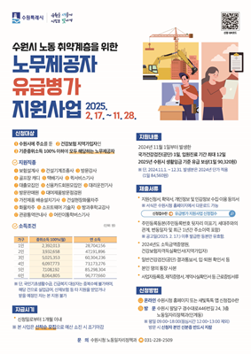 ¼ö¿ø½Ã´Â 11¿ù 28ÀϱîÁö ¡®2025³â ¼ö¿ø½Ã ³ëµ¿Ãë¾à°èÃþ ³ë¹«Á¦°øÀÚ À¯±Þº´°¡ Áö¿ø»ç¾÷¡¯ ½ÅûÀ» ¹Þ´Â´Ù.
