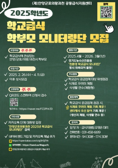 Àç)¾È¾ç¡¤±ºÆ÷¡¤Àǿա¤°úõ °øµ¿±Þ½ÄÁö¿ø¼¾ÅÍ(ÀÌ»çÀå ÃÖ´ëÈ£ ¾È¾ç½ÃÀå, ÇÏÀºÈ£ ±ºÆ÷½ÃÀå, ±è¼ºÁ¦ ÀǿսÃÀå, ½Å°è¿ë °úõ½ÃÀå)´Â Çкθ𸦠´ë»óÀ¸·Î ¡®2025Çг⵵ Çб³±Þ½Ä Çкθð ¸ð´ÏÅ͸µ´Ü¡¯ 100¸íÀ» ¸ðÁý ÁßÀ̶ó°í 5ÀÏ ¹àÇû´Ù.