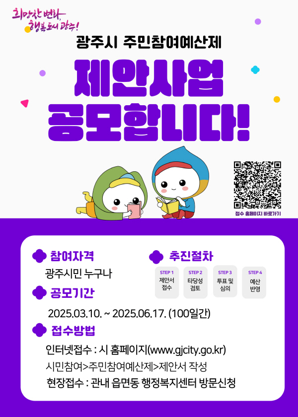 »ç¾÷ Á¦¾ÈÀº ±¤ÁֽùΠ´©±¸³ª Á¦¾ÈÇÒ ¼ö ÀÖÀ¸¸ç °ø¸ð ±â°£ ³» ȨÆäÀÌÁö(½Ã¹ÎÂü¿©¡æÁÖ¹ÎÂü¿©¿¹»êÁ¦¡æÁ¦¾È¼ÀÛ¼º)¸¦ ÅëÇØ ¿Â¶óÀÎÀ¸·Î ½ÅûÇϰųª °ÅÁÖ À¾¸éµ¿ ÇàÁ¤º¹Áö¼¾ÅÍ¿¡¼ ¿ÀÇÁ¶óÀÎÀ¸·Î ¸ðµÎ ½ÅûÇÒ ¼ö ÀÖ´Ù.