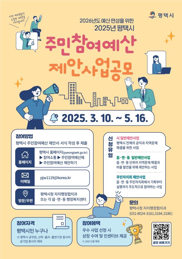 ÆòÅýÃ(½ÃÀå Á¤Àå¼±)°¡ 3¿ù 10ÀϺÎÅÍ 5¿ù 16ÀϱîÁö 2026³âµµ ¿¹»ê Æí¼ºÀ» À§ÇÑ 2025³âµµ ÁÖ¹ÎÂü¿©¿¹»ê Á¦¾È»ç¾÷ °ø¸ð¸¦ ½ÃÇàÇÑ´Ù.