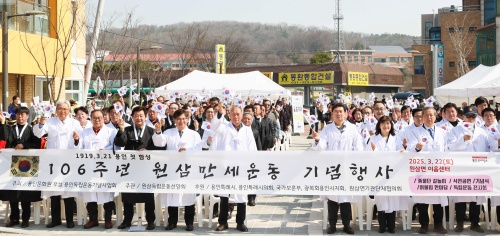 ¿ëÀÎÆ¯·Ê½Ã(½ÃÀå ÀÌ»óÀÏ)´Â 22ÀÏ ¿ÀÀü óÀα¸ ¿ø»ï¸é ÀÌÀ½¼¾ÅÍ ¾ß¿Ü¹«´ë¿¡¼ 106³â Àü ÀϾ´ø ¿ëÀÎ 3¡¤21 ¸¸¼¼¿îµ¿ ±â³äÇÏ´Â Çà»ç°¡ ÀÌ»óÀÏ ½ÃÀå µîÀÌ Âü¼®ÇÑ °¡¿îµ¥ ¿·È´Ù°í ¹àÇû´Ù.