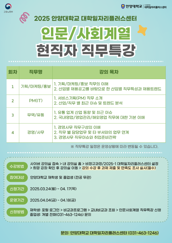 ¾È¾ç´ëÇб³ ´ëÇÐÀÏÀÚ¸®Ç÷¯½º¼¾ÅÍ, ¡®2025³â Á÷¹« Ư°­ ¹× ½Ç¹« ¸àÅ丵 ÇÁ·Î±×·¥¡¯ ¿î¿µ