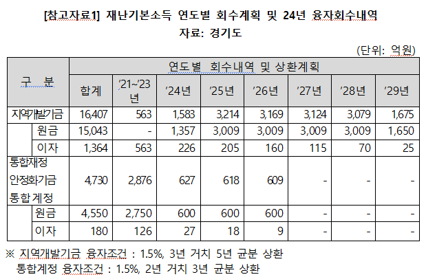 ÀÚ·á¿¡ µû¸£¸é µÎ ±â±ÝÀ¸·Î »óÈ¯ÇØ¾ßÇÏ´Â ±Ý¾×Àº ÀÌÀÚ¿Í ¿ø±ÝÀ» ÇÕÃÄ ÃÑ 2Á¶ 1,137¾ï¿ø(Áö¿ª°³¹ß±â±Ý ¿ø±Ý 1Á¶ 5,043¾ï¿ø, ÀÌÀÚ 1,364¾ï¿ø, ÅëÇÕÀçÁ¤¾ÈÁ¤È­±â±Ý¿¡ ¿ø±Ý 4,550¾ï, ÀÌÀÚ 180¾ï)¿¡ À̸£´Â °ÍÀ¸·Î ³ªÅ¸³µ´Ù. °æ±âµµ´Â ÀÌ Áß Áö¿ª°³¹ß±â±Ý¿¡ ´ëÇÑ »óȯÀ» 2029³â±îÁö, ÅëÇÕÀçÁ¤¾ÈÁ¤È­±â±Ý¿¡ ´ëÇØ¼­´Â 2026³â±îÁö »óȯÀ» ¸¶¹«¸®Çϰڴٴ °èȹÀÌ´Ù. À̷νá ÃÑ ÀÌÀÚ ºÎ´ã¸¸ 1,544¾ï ¿ø¿¡ ´ÞÇϸç, ÀÌ´Â ¸ðµÎ ÇâÈÄ µµ ¿¹»ê(ÀϹÝȸ°è)¿¡¼­ Ãæ´çµÉ ¿¹Á¤ÀÌ´Ù.
