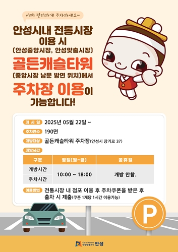 °ñµçij½½Å¸¿ö ÁÖÂ÷Àå ÀÌ¿ë¹æ¹ýÀº ÆòÀÏ¿¡ ÇÑÇÏ¿© 10½ÃºÎÅÍ 18½Ã±îÁö °³¹æµÇ¸ç, ¾È¼ºÁß¾Ó½ÃÀå°ú ¾È¼º¸ÂÃã½ÃÀå ³» Á¡Æ÷¸¦ ÀÌ¿ë ÈÄ ÁÖÂ÷ÄíÆùÀ» ¹ÞÀº ÈÄ Â÷·® ÃâÂ÷ ½Ã¿¡ Á¦ÃâÀ» ÇÏ¸é µÈ´Ù.