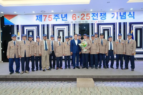 ¿À»ê½Ã(½ÃÀå À̱ÇÀç)°¡ 25ÀÏ ¿À»ê ¿þµùÀÇ Àü´ç¿¡¼ ¡®6¡¤25ÀüÀï Á¦75Áֳ⠱â³ä½Ä¡¯À» ¿°í ÂüÀü¿ë»ç¿Í º¸ÈÆ °¡Á·¿¡°Ô ±íÀº °¨»ç¿Í Á¸°æÀ» ÀüÇß´Ù.