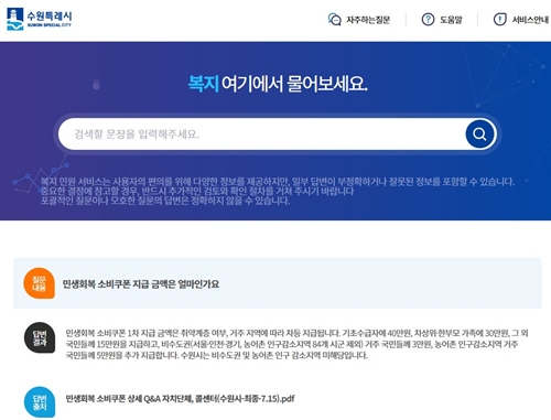 ¼ö¿ø½Ã(½ÃÀå ÀÌÀçÁØ)´Â 21ÀϺÎÅÍ ½ÃÀÛµÈ ¡®¹Î»ýȸº¹ ¼ÒºñÄíÆù¡¯ Áö±Þ¿¡ ´ëÇÑ ¾÷¹« ºÎ´ãÀ» ÁÙÀ̱â À§ÇØ ¡®¼ö¿ø½Ã ÀΰøÁö´É(AI) º¹Áö ¹Î¿ø ¼ºñ½º¡¯¸¦ Ȱ¿ëÇϰí ÀÖ´Ù.