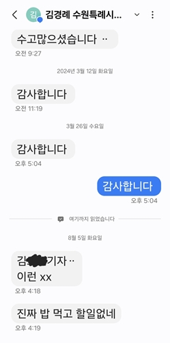 ±è ÀÇ¿øÀº 8¿ù 5ÀÏ, ÇØ´ç ±â»ç¸¦ ÀÛ¼ºÇÑ ±âÀÚ¿¡°Ô ¹®ÀÚ·Î ¡°±èOO ±âÀÚ¡¦ ÀÌ·± XX¡±, ¡°ÁøÂ¥ ¹ä ¸Ô°í ÇÒ ÀÏ ¾ø³×¡±¶ó´Â ¸Þ½ÃÁö¸¦ ¹ß¼ÛÇß´Ù. ÀÌ·¯ÇÑ Ç¥ÇöÀº ±è ÀÇ¿øÀÌ °ú°Å µ¿ÀÏ ±âÀÚ¿¡°Ô º¸³Â´ø ¡°¼ö°í ¸¹À¸¼Ì½À´Ï´Ù¡±, ¡°°¨»çÇÕ´Ï´Ù¡±¿Í °°Àº °ø¼ÕÇÑ Åµµ¿Í ºñ±³ÇØ °¨Á¤Àû ´ëÀÀÀÌ µµ¸¦ ³ÑÀº ¾ðÇàÀ̶ó´Â ÁöÀûÀ» ¹Þ°í ÀÖ´Ù.