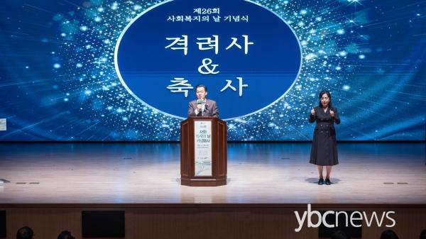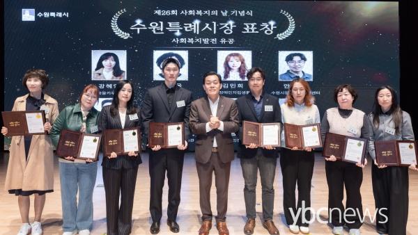 ±â³ä½ÄÀº »çȸº¹Áö À¯°ø ǥâ ¼ö¿©, ÀÌÀçÁØ ½ÃÀåÀÇ Ãà»ç, »çȸº¹Áö»ç¾÷ À±¸®¼±¾ð¹® ³¶µ¶, AI(ÀΰøÁö´É) ¹Ìµð¾î¾ÆÆ® ¿µ»ó »ó¿µ µîÀ¸·Î ÁøÇàµÆ´Ù. º¸°Çº¹ÁöºÎ Àå°ü ǥâ(1¸í), ¼ö¿ø½ÃÀå ǥâ(23¸í), ¼ö¿ø½ÃÀÇȸ ÀÇÀå ǥâ(3¸í), ¼ö¿ø½Ã»çȸº¹ÁöÇùÀÇȸÀå ǥâ(3¸í), ¼ö¿ø½Ã»çȸº¹Áö»çÇùȸÀå ǥâ(3¸í) µî »çȸº¹ÁöÀ¯°øÀÚ ÃÑ 39¸í¿¡°Ô ǥâÀ» ¼ö¿©Çß´Ù.