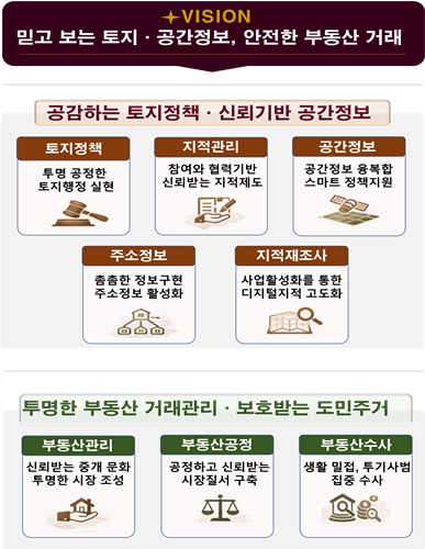 ÃßÁø°èȹÀº ¡ãÅõ¸íÇÏ°í ±ÕÇü ÀâÈù Á¦µµ ¿î¿µÀ¸·Î ½Å·Ú¹Þ´Â ÅäÁöÇàÁ¤ ½ÇÇö ¡ãÂü¿©¿Í Çù·ÂÀ» ÅëÇÑ ½Å·Ú¹Þ´Â ÁöÀûÁ¦µµ Á¤Âø ¡ã°ø°£Á¤º¸ À¶¡¤º¹ÇÕÀ» ÅëÇÑ ½º¸¶Æ®ÇÑ Á¤Ã¥ Áö¿ø ¡ãÃÎÃÎÇÑ ÁÖ¼ÒÁ¤º¸ ±¸Çö ¹× ÁÖ¼ÒÁ¤º¸ Ȱ¼ºÈ ÃßÁø ¡ã»ç¾÷Ȱ¼ºÈ¸¦ ÅëÇÑ µðÁöÅÐÁöÀû °íµµÈ ¡ã½Å·Ú¹Þ´Â Áß°³ ¹®È¿Í Åõ¸íÇÑ ºÎµ¿»ê ½ÃÀå Á¶¼º ¡ã°øÁ¤ÇÏ°í ½Å·Ú¹Þ´Â ½ÃÀåÁú¼ ±¸Ãà ¡ã»ýȰ¹ÐÁ¢, Åõ±â»ç¹ü ÁýÁß¼ö»ç µî 8´ë Àü·«À» ¹ÙÅÁÀ¸·Î ÇÑ 92°³ ¼¼ºÎ ÀÌÇà°úÁ¦·Î ±¸¼ºµÆ´Ù.