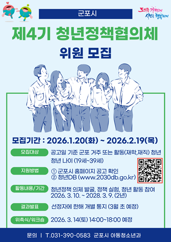 ±ºÆ÷½Ã(½ÃÀå ÇÏÀºÈ£)´Â Á¦4±â ±ºÆ÷½Ã û³âÁ¤Ã¥ÇùÀÇü À§¿øÀ» ¿À´Â 2¿ù 19ÀÏ(¸ñ)±îÁö ¸ðÁýÇÑ´Ù°í ¹àÇû´Ù.