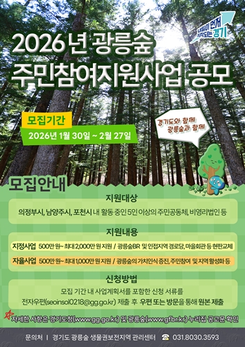 °æ±âµµ°¡ ±¤¸ª½£ »ý¹°±Çº¸ÀüÁö¿ª Ȱ¼ºÈ¸¦ À§ÇØ 2026³â ±¤¸ª½£ ÁÖ¹ÎÂü¿©Áö¿ø»ç¾÷ Âü¿©ÀÚ¸¦ ¸ðÁýÇÑ´Ù.