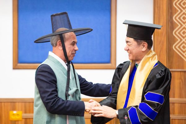 Á¤Àå¼± ÆòÅýÃÀåÀÌ ´ëÇÐ ¸í¿¹±³¼ö·Î ÀÓ¸íµÈ °¡¿îµ¥, ÆòÅýð¡ ¼±¹°ÇÑ ÇѺ¹À» ÀÔÀº ŸŲ Å×»þ¹Ù¿¹ÇÁ ÃÑÀå°ú ¾Ç¼ö¸¦ ³ª´©°í ÀÖ´Ù.