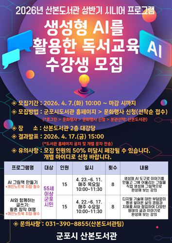 ±ºÆ÷½Ã »êº»µµ¼°ü, ½Ã´Ï¾î ´ë»ó ¡®»ý¼ºÇü AI Ȱ¿ë µ¶¼±³À°¡¯ ¿î¿µ...½Ã´Ï¾î°¡ »ý¼ºÇü AI¸¦ Ȱ¿ëÇÑ Ã¢ÀÛ È°µ¿¿¡ Âü¿©ÇÒ ¼ö ÀÖµµ·Ï Áö¿ø - µðÁöÅÐ ¼Ò¿Ü °èÃþ¿¡¼ ´Éµ¿Àû ¡®Ã¢ÀÛ ÁÖü¡¯·Î, AI Ȱ¿ë ±×¸²Ã¥ ¹× ±Û¾²±â °úÁ¤ ¸ðÁý |