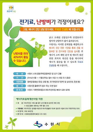 ¼ö¿ø½Ã(½ÃÀå ¿°Å¿µ)°¡ °íÀ¯°¡ ½Ã´ë ¿¡³ÊÁö Àý¾à°ú Àúź¼Ò ³ì»ö¼ºÀå ½ÇÇöÀ» À§ÇØ ¿¡³ÊÁö °¨Ãà ÀáÀç·®ÀÌ Å« °øµ¿ÁÖÅðú »ó¾÷½Ã¼³À» ´ë»óÀ¸·Î ¿À´Â 11¿ù±îÁö ¿¡³ÊÁö Áø´Ü ¹«·á ÄÁ¼³ÆÃ ¼ºñ½º¸¦ ½Ç½ÃÇÑ´Ù.