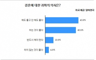 ¹Ý´ë·Î ¡®°áÈ¥À» ÇÏ´Â °ÍÀÌ ÁÁ´Ù¡¯¿Í ¡®¹Ýµå½Ã ÇØ¾ß ÇÑ´Ù¡¯´Â ÀǰßÀº °¢°¢ 40.6%, 10.8%¸¦ Â÷ÁöÇØ °áÈ¥À» ±àÁ¤ÀûÀ¸·Î »ý°¢ÇÏ´Â ¿©¼º ¿ª½Ã Àý¹Ý Á¤µµÀÎ °ÍÀ¸·Î ³ªÅ¸³µ´Ù.