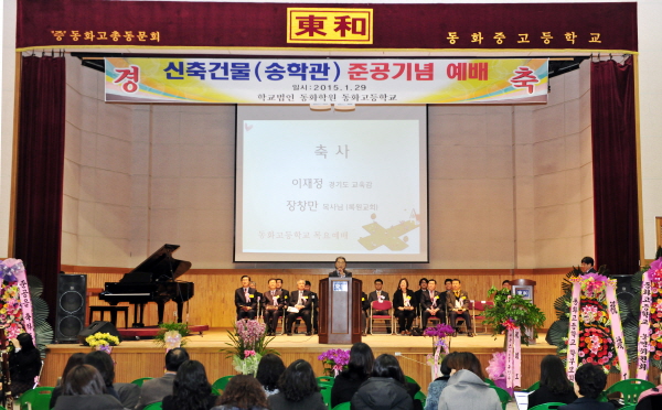 µ¿È°íµîÇб³ ½ÅÃà °Ç¹°ÀÎ ¡®¼ÛÇаü¡¯Àº ±âÁ¸ °Ç¹°ÀÌ ³ëÈÄȵŠÁ¤¹Ð¾ÈÀüÁø´Ü °á°ú D±Þ ÆÇÁ¤µÈ µ¥ µû¶ó 2012³â °æ±âµµ±³À°Ã» ±³À°½Ã¼³¹° °³Ãà ½ÉÀÇÀ§¿øÈ¸ÀÇ °³Ãà °áÁ¤¿¡ ÀÇÇØ 2013³â °ø»ç¿¡ Âø°øÇÏ¿´°í, À̳¯ Áذø±â³ä½ÄÀ» °¡Á³´Ù.