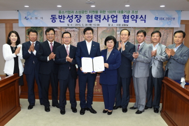 ¼ö¿ø½Ã(½ÃÀå ¿°Å¿µ)¿Í IBK±â¾÷ÀºÇà(ÀºÇàÀå ±Ç¼±ÁÖ)ÀÌ 100¾ï ¿øÀÇ ´ëÃâ Àç¿øÀ» Á¶¼ºÇØ ¼ö¿ø½Ã Áß¼Ò±â¾÷°ú ¼Ò»ó°øÀÎ Áö¿ø¿¡ ³ª¼±´Ù.
