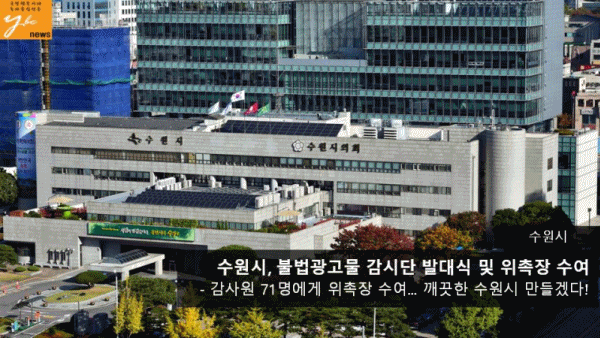 ¼ö¿ø½Ã´Â 23ÀÏ ¼ö¿ø½ÃÀå±â¿ä¾çÁö¿ø¼¾ÅÍ¿¡¼ ¡®ºÒ¹ý±¤°í¹° °¨½Ã´Ü¡¯ ¹ß´ë½ÄÀ» ¿°í, °¨½Ã¿ø 71¸í¿¡°Ô À§ÃËÀåÀ» ¼ö¿©Çß´Ù.