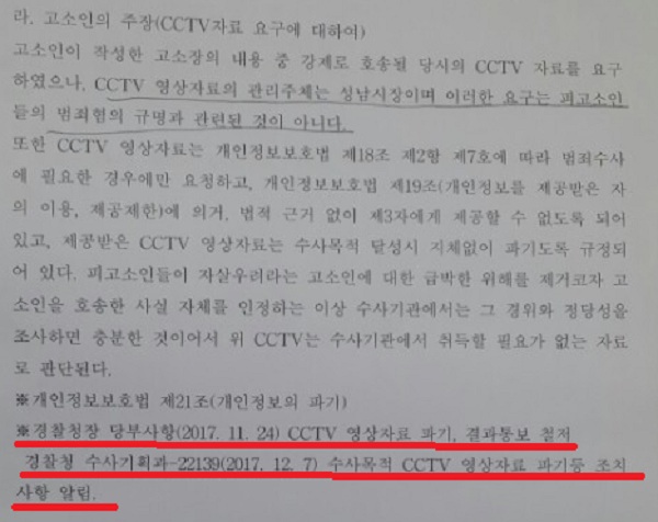 ÇÑÆí, ÀÌÀ¯Áø°Ë»ç°¡ ÀÛ¼ºÇÑ CCTV¿µ»óÆÄ±â °æÂû¿¡ ´ëÇÑ °í¼ÒÀå¿¡ ´ëÇÑ ºÒ±â¼ÒÀÌÀ¯ÅëÁö¹®¿¡´Â ¡°CCTV ¿µ»óÀÚ·áÀÇ °ü¸®ÁÖü´Â ¼º³²½ÃÀåÀ̸ç ÀÌ·¯ÇÑ ¿ä±¸´Â Çǰí¼ÒÀεéÀÇ ¹üÁËÇøÀÇ ±Ô¸í°ú °ü·ÃµÈ °ÍÀÌ ¾Æ´Ï´Ù¡°¶ó°í Àû½ÃÇÏ¸ç °³ÀÎÁ¤º¸º¸È£¹ý Á¦ 18Á¶ 2Ç× Á¦ 7È£, Á¦ 19Á¶ÀÇ ±Ù°Å¸¦ µé¾î ¼ö»ç±â°ü¿¡¼ ÃëµæÇÒ Çʿ䰡 ¾ø´Â ÀÚ·á·Î ÆÇ´ÜµÈ´Ù°í Àû½ÃÇß´Ù. ¶ÇÇÑ °³ÀÎÁ¤º¸º¸È£¹ý Á¦ 21Á¶¸¦ °³ÀÎÁ¤º¸ÀÇ ÆÄ±â ±Ù°Å·Î Á¦½ÃÇϰí ÀÖ´Ù.