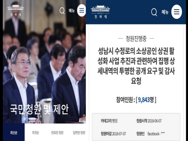 Áö³ 7ÀÏ Ã»¿Í´ë û¿ø°Ô½ÃÆÇ¿¡´Â ¡°¼º³²½Ã ¼öÁ¤·ÎÀÇ ¼Ò»ó°øÀÎ »ó±Ç Ȱ¼ºÈ »ç¾÷ ÃßÁø°ú °ü·ÃÇÏ¿©..¡±¶ó´Â Á¦¸ñÀÇ ±¹¹Îû¿øÀÌ µîÀåÇØ ´«±æÀ» ²ø°í ÀÖ´Ù.