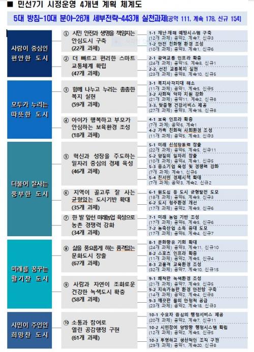 ¡â¾È½Éµµ½Ã ±¸Ãà ¡â½º¸¶Æ® ±³Åëü°è È®¸³ ¡âÃÎÃÎÇÑ º¹Áö ½ÇÇö ¡â¾È½ÉÇÏ´Â º¸À°È¯°æ Á¶¼º ¡âÀÏÀÚ¸® Áß½ÉÀÇ °æÁ¦ À°¼º ¡â±ÕÇüÀÖ´Â µµ½Ã±â¹Ý È®´ë ¡â³óÃÌ °æÀï·Â °È ¡â°Ç°ÇÑ ³ì»öµµ½Ã È®Ãæ ¡â°ø°¨ÇàÁ¤ ±¸Çö µî 10´ë ºÐ¾ß¸¦ ½ÇÇöÇϱâ À§ÇÑ 26°³ ¼¼ºÎÀü·«, 443°³ ½Çõ°úÁ¦¸¦ Á¦½ÃÇß´Ù.