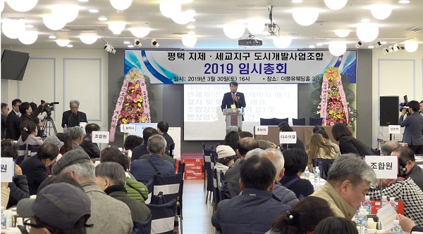 ÆòÅà ÁöÁ¦․¼¼±³Áö±¸ µµ½Ã°³¹ß»ç¾÷Á¶ÇÕÀº Áö³ ´Þ 30ÀÏ ´õºíÀ¯¿þµùȦ 3Ãþ¿¡¼ ÀÓ½ÃÃÑȸ¸¦ °³ÃÖÇϰí Âü¼®Á¶ÇÕ¿ø 145¸íÁß 115¸íÀÇ ¾ÐµµÀûÀÎ Âù¼ºÇ¥¸¦ ¾ò¾î ½ÅÀÓ Á¶ÇÕÀåÀ¸·Î ¹ÚÁ¾¼± Àü Á¶ÇÕÀåÀ» ¼±ÃâÇÏ¿´´Ù.