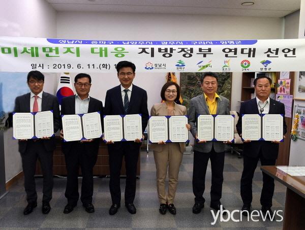 6¿ù 11ÀÏ ¿ÀÈÄ 2½Ã ¼º³²½Ãû 2Ãþ ½ÃÀå Áý¹«½Ç¿¡ ¸ðÀÎ ¼º³²½Ã, ¼¿ï ¼ÛÆÄ±¸, ³²¾çÁÖ½Ã, ±¤ÁÖ½Ã, ±¸¸®½Ã, ¾çÆò±º ÁöÀÚü ´ëÇ¥ÀÚµéÀº ¡®¹Ì¼¼¸ÕÁö °øµ¿ ´ëÀÀ Áö¹æÁ¤ºÎ ¿¬´ë ¼±¾ð½Ä¡¯À» ÁøÇàÇß´Ù.