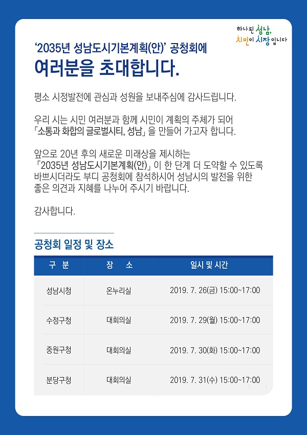¼º³²½Ã ¡®2035³â µµ½Ã±âº»°èȹ °øÃ»È¸¡¯ °³ÃÖ! -°øÃ»È¸ ÀÏÁ¤ ¡ã7¿ù 26ÀÏ ¼º³²½Ãû ¿Â´©¸® ¡ã7¿ù 29ÀÏ ¼öÁ¤±¸Ã» ´ëȸÀÇ½Ç ¡ã7¿ù 30ÀÏ Áß¿ø±¸Ã» ´ëȸÀÇ½Ç ¡ã7¿ù 31ÀÏ ºÐ´ç±¸Ã» ´ëȸÀÇ½Ç µîÀ̸ç, °¢°¢ ¿ÀÈÄ 3½Ã ¿·Á |