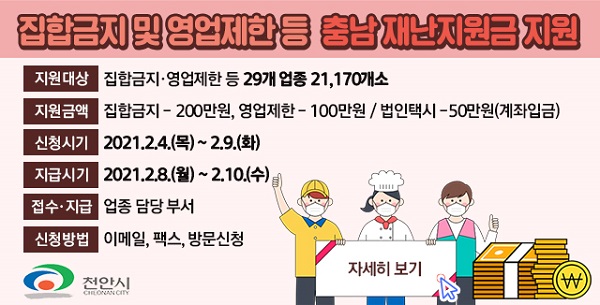õ¾È½Ã°¡ Äڷγª19 ¹æ¿ª°È Á¶Ä¡ ÀÏȯÀ¸·Î »ý°è¿¡ À§ÇùÀ» ¹Þ°í ÀÖ´Â ÁýÇÕ±ÝÁö ¹× ¿µ¾÷Á¦ÇÑ µ¿Âü ÀÚ¿µ¾÷ÀÚ¿Í ¼Ò»ó°øÀÎ, Áö¿ø »ç°¢Áö´ë¿¡ ³õ¿© ÀÖ´Â ¹ýÀÎÅýà ¿îÀüÀÚ¸¦ ´ë»óÀ¸·Î ÃæÃ»³²µµ Àç³Áö¿ø±ÝÀ» Áö±ÞÇÑ´Ù.