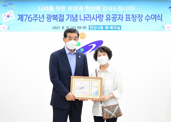 À±È­¼· ¾È»ê½ÃÀåÀº Á¦76Áֳ⠱¤º¹ÀýÀ» ±â³äÇØ µ¶¸³À¯°øÀÚ °í(ͺ) ¼ÕÅÂÁØ(1911~1950) ¼±»ýÀÇ µþ ¼ÕÈ­ÀÚ ¾¾¿¡°Ô ¡®³ª¶ó»ç¶û À¯°øÀÚ Ç¥Ã¢À塯À» ¼ö¿©Çß´Ù.