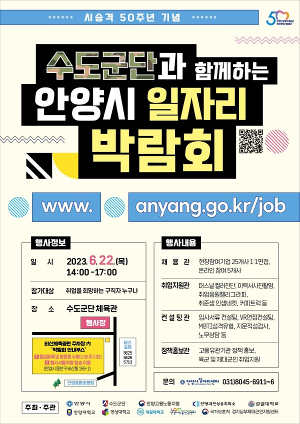 ¾È¾ç½Ã´Â ½Ã ½Â°Ý 50ÁÖ³âÀ» ¸Â¾Æ ¡®¼öµµ±º´Ü°ú ÇÔ²²ÇÏ´Â ¾È¾ç½Ã ÀÏÀÚ¸® ¹Ú¶÷ȸ¡¯¸¦ ¿À´Â 22ÀÏ ¿ÀÈÄ 2½Ã ¼öµµ±º´Ü üÀ°°ü¿¡¼ °³ÃÖÇÑ´Ù°í 19ÀÏ ¹àÇû´Ù.