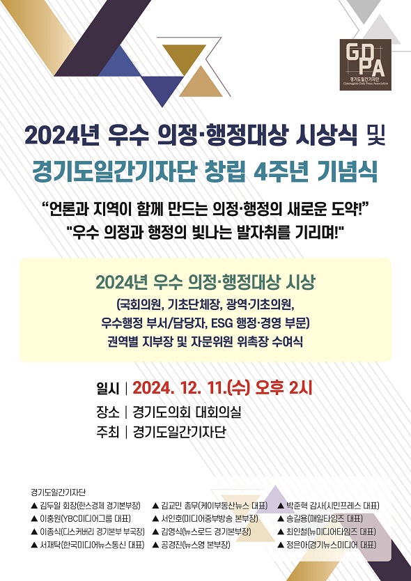 °æ±âµµÀϰ£±âÀÚ´ÜÀÌ ÁÖÃÖÇÏ´Â ¡®Ã¢¸³4Áֳ⡯ ±â³ä½Ä ¹× ¡®2024 ¿ì¼öÀÇÁ¤¡¤ÇàÁ¤ ´ë»ó ½Ã»ó½Ä¡¯ÀÌ ¿À´Â 12¿ù 11ÀÏ(¼ö) ¿ÀÈÄ 2½Ã, °æ±âµµÀÇȸ ÁöÇÏ 1Ãþ ´ëȸÀǽǿ¡¼ °³ÃֵȴÙ. À̹ø ½Ã»ó½ÄÀº Áö¹æÀÇȸ¿Í ÇàÁ¤±â°üÀÇ ¿ì¼ö »ç·Ê¸¦ ¹ß±¼ÇÏ°í °ø·Î¸¦ Ä¡ÇÏÇÔÀ¸·Î½á ÀÚÄ¡ºÐ±Ç°ú Áö¿ª»çȸÀÇ Áö¼Ó °¡´ÉÇÑ ¹ßÀüÀ» ÃËÁøÇϱâ À§ÇØ ¸¶·ÃµÆ´Ù.