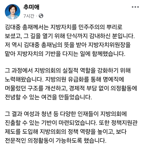 ´õºÒ¾î¹ÎÁÖ´ç °æ±âµµÁö»ç °æ¼±¿¡ ³ª¼± Ãß¹Ì¾Ö °æ¼±È帴 26ÀÏ ÀÚ½ÅÀÇ SNS¸¦ ÅëÇØ Áö¹æÀÇȸÀÇ ±ÇÇÑ °­È­¸¦ ÅëÇØ ¡®½ÇÁúÀû Áö¹æÀÚÄ¡¡¯ ±¸Çö¿¡ ³ª¼­°Ú´Ù´Â ±¸»óÀ» ¹àÇû´Ù.