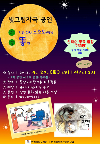 ¾È¼º½Ã Áß¾Óµµ¼­°üÀº Á¦49ȸ µµ¼­°üÁÖ°£ ¹× Ã¥ÀÇ ³¯À» ¸Â¾Æ ¿À´Â 20ÀÏ(Åä) ¿ÀÀü 11½Ã, ¿ÀÈÄ 2½Ã ÃÑ 2ȸ¿¡ °ÉÃÄ À¯¾Æ¡¤¾î¸°À̸¦ À§ÇÑ ¡®ºû±×¸²Àڱء¯ °ø¿¬À» °³ÃÖÇÑ´Ù.