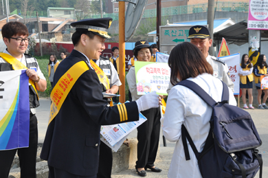 ¶ÇÇÑ, Á×»êÁßÇб³ ¾Õ »ï°Å¸®¿¡¼ Çб³Æø·Â ±ÙÀý È«º¸Àü´ÜÁö 1,000¸Å, ÇÚµåÅ©¸² 100°³, Çü±¤ÆÒ 500°³¸¦ Çлýµé¿¡°Ô ³ª´²ÁÖ¸é¼ Çб³Æø·Â ¿¹¹æÈ°µ¿À» ÆîÃÆ´Ù.