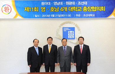 ¿µÈ£³²À» ´ëÇ¥ÇÏ´Â 4°³ ´ëÇб³ ÃÑÀåµéÀÌ ÇÑÀÚ¸®¿¡ ¸ð¿© ±³·ù ¹æ¾ÈÀ» ÇùÀÇÇÏ´Â ¡®Á¦11ȸ ¿µÈ£³² 4°³´ëÇб³ ÃÑÀåÇùÀÇȸ¡¯°¡ 5¿ù 21ÀÏ ¿ÀÀü 11½Ã Á¶¼±´ëÇб³ º»°ü 2Ãþ ¼ÒȸÀǽǿ¡¼­ ¿­·È´Ù.