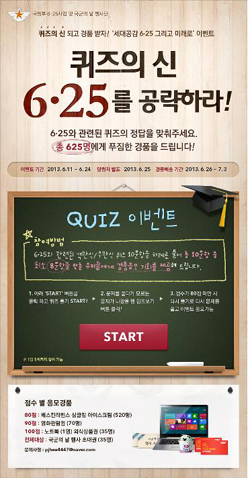 'ÄûÁîÀÇ ½Å, 6¡¤25¸¦ °ø·«Ç϶ó!'¶ó´Â Á¦¸ñÀÇ 1Â÷ À̺¥Æ®´Â 11ÀϺÎÅÍ 25ÀÏ(È)±îÁö ½Ç½ÃÇϸç, Çà»ç´Ü °ø½Ä ºí·Î±×(http://koreanwar60.tistory.com)¸¦ ¹æ¹®ÇÏ¿© 6¡¤25¿Í °ü·ÃµÈ 10¹®Á¦ Áß 8¹®Á¦ ÀÌ»óÀ» ¸ÂÃá ÀÀ¸ðÀÚ¸¦ ´ë»óÀ¸·Î ÃÑ 625¸íÀ» Ãß÷ÇÏ¿© ³ëÆ®ºÏ, ¿Ü½Ä»óǰ±Ç µî ´Ù¾çÇÑ »óǰÀ» ¼ö¿©ÇÑ´Ù.