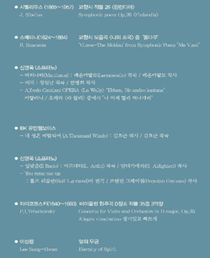 ÁöÈÖÀÚ ±Ý³»õ, ¼ÒÇÁ¶ó³ë ½Å¿µ¿Á µî ´ëÇѹα¹À» ´ëÇ¥ÇÏ´Â Á¤»ó±Þ À½¾Ç°¡µéÀÌ Ã⿬Çϸç, ³ªÀÇ Á¶±¹ µî ¡®³ª¶ó»ç¶û¡¯À» ÁÖÁ¦·Î ÇÑ °íǰ°Ý Ŭ·¡½Ä À½¾Ç ¿¬ÁÖ·Î ¡®°¨µ¿ÀÇ ¹«´ë¡¯¸¦ ¼±»çÇÒ °èȹÀÌ´Ù. ƯÈ÷, °ø¿¬ Àü ±¹¹ÎÀǷʸ¦ ÅëÇØ ±¹°¡¿Í ³ª¶ó¸¦ À§ÇØ Èñ»ý․°øÇåÇϽмø±¹¼±¿°ú È£±¹¿µ·É¿¡ ´ëÇÑ °¨»çÀÇ ½Ã°£À» °¡Áø´Ù.