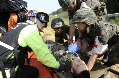 ¹Î¤ý°ü¤ý±º ÅëÇÕ ¼ºÏµµ¼ ȯÀÚ Çï±âÈÄ¼Û ÈÆ·Ã ‐ ÇØº´´ë»ç·ÉºÎ ÁÖ°ü, ¾ÆÁÖ´ë ÁßÁõ¿Ü»ó¼¾ÅÍÀå À̱¹Á¾ ±³¼öÆÀ ÈÆ·Ã Âü°¡ |