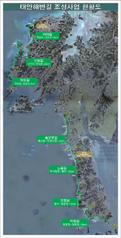 žÈÇØº¯±æÀº À̹ø »ûº°±æ, ¹Ù¶÷±æ °³ÅëÀ¸·Î ±âÁ¸¿¡ ´Ü°èº°·Î Á¶¼ºµÈ ¹Ù¶ó±æ(ÇÐ¾ÏÆ÷¡½ÅµÎ¸®, 12km), ¼Ò¿ø±æ(½ÅµÎ¸®¡¸¸¸®Æ÷, 22km), ÆÄµµ±æ(¸¸¸®Æ÷¡ÆÄµµ¸®, 9km), ¼Ö¸ð·§±æ(¸ù»êÆ÷¡µå¸£´ÏÇ×, 13km), ³ëÀ»±æ(¹é»çÀåÇס²ÉÁö, 12km) µî ÃÑ 7°³ ±¸°£ 97km¸¦ ¿ÏÀü °³ÅëÇÏ°Ô µÆ´Ù.