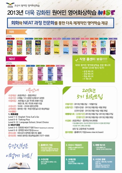 ¼ö°­À» ¿øÇÏ´Â ´ë»óÀÚ´Â ±âÁ¸ ¼ö°­ÀÚÀÇ °æ¿ì 8¿ù 9ÀϺÎÅÍ 28ÀϱîÁö, ½Å±Ô ¼ö°­ÀÚÀÇ °æ¿ì 8¿ù 16ÀϺÎÅÍ 28ÀϱîÁö ¿À»ê½Ã ¿ø¾î¹Î ¿µ¾îÈ­»óÇнÀ ȨÆäÀÌÁö(www.nise.kr/osan)¿¡¼­ ½ÅûÇÏ¸é µÈ´Ù.