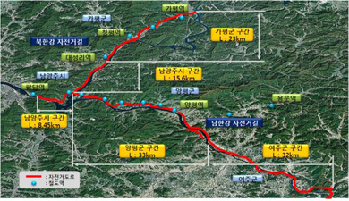 2011³â 11¿ù °³Åë, ³²ÇѰ­ ÀÚÀü°Åµµ·Î 73.4km. 2012³â 12¿ù °³Åë, ºÏÇѰ­ ÀÚÀü°Åµµ·Î 38.6km. ÃѱæÀÌ 112km¿¡ À̸£´Â ³²¡¤ºÏÇѰ­ ÀÚÀü°Åµµ·Î´Â ö±³, ÅͳÎ, ¿ª, °­º¯À» ¾Æ¿ì¸£´Â Æóöµµ¸¦ Áö³ª ÀÌ»öÀûÀΠdz°æ°ú ¾î¿ì·¯Áø´Ù.