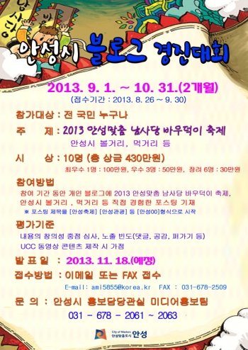 ¾È¼º½Ã´Â ¿À´Â 9¿ù 1ÀϺÎÅÍ 10¿ù 31ÀϱîÁö Àü ±¹¹ÎÀ» ´ë»óÀ¸·Î ¡®2013 ¾È¼º½Ã ºí·Î±× °æÁø´ëȸ¡¯¸¦ ½Ç½ÃÇÑ´Ù.