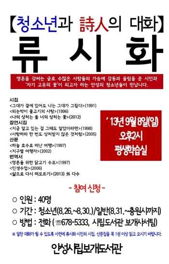 [¾È¼º] º¸°³µµ¼°ü, 'û¼Ò³â°ú ½ÃÀÎÀÇ ´ëÈ' ¿î¿µ - ¿À´Â 9¿ù 8ÀÏ ¿ÀÈÄ 2½Ã ·ù½ÃÈ ½ÃÀÎ ÃÊû ãÌ¿Í ¹®Çп¡ ´ëÇÑ ´Ù¾çÇÑ ´ëÈ |